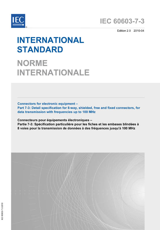 IEC 60603-7-3:2010 covers 8-way, shielded, free and fixed connectors, references dimensional, mechanical, electrical and environmental characteristics and tests in IEC 60603-7 and IEC 60603-7-1, and specifies electrical transmission requirements for frequencies up to 100 MHz. These connectors are typically used as category 5 connectors in class D cabling systems specified in ISO/IEC 11801. These connectors are intermateable and interoperable with other IEC 60603-7 series connectors as defined in Clause 2 of IEC 60603-7. These connectors are backward compatible with other IEC 60603-7 series connectors.