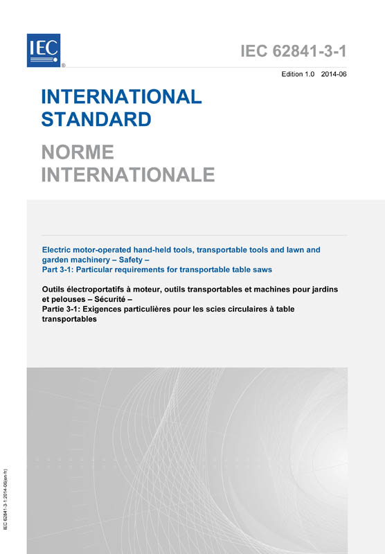 - a moulding head cutter intended for cutting wood and analogous materials, plastics and nonferrous metals except magnesium with a saw blade diameter between 105 mm and 315 mm, which hereinafter may simply be referred to as saw or tool. The rated voltage is not more than 250 V for single-phase a.c. or d.c. tools, and 480 V for three-phase a.c. tools. The rated input is not more than 3 700 W. The limits for the applicability of this standard for battery tools is given in Annex K. This standard deals with the hazards presented by tools which are encountered by all persons in the normal use and reasonably foreseeable misuse of the tools. This standard does not apply to table saws intended to cut other metals, such as magnesium, steel and iron. This standard does not apply to table saws with an automatic feeding device. This standard does not apply to saws designed for use with abrasive wheels. This standard does not apply to table saws with more than one spindle such as for a scoring blade. The attention of National Committees is drawn to the fact that equipment manufacturers and testing organizations may need a transitional period following publication of a new, amended or revised IEC publication in which to make products in accordance with the new requirements and to equip themselves for conducting new or revised tests. It is the recommendation of the committee that the content of this publication be adopted for implementation nationally not earlier than 36 months from the date of publication. Key words: Table Saw, Transportable