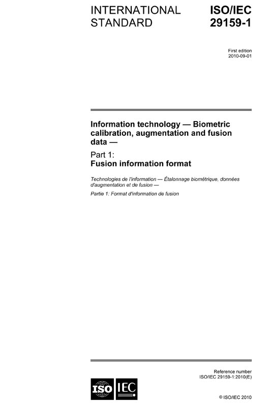 ISO/IEC 29159-1:2010 specifies a biometric fusion information format that establishes machine readable data formats to describe the statistics of comparison score inputs to a fusion process.