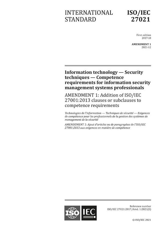 Information technology - Security techniques - Competence requirements for information security management systems professionals - Amendment 1: Addition of ISO/IEC 27001:2013 clauses or subclauses to competence requirements