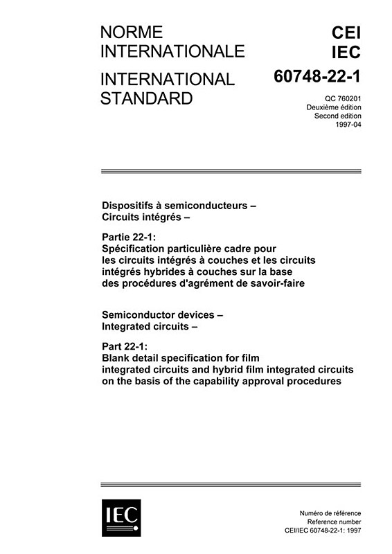 Semiconductor devices - Integrated circuits - Part 22-1: Blank detail specification for film integrated circuits and hybrid film integrated circuits on the basis of the capability approval procedures