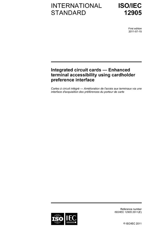 ISO/IEC 12905:2011 specifies a set of data elements to be personalized into an integrated circuit card, encoding cardholder preferences. These data elements are to be retrieved from the card and to be used to indicate to the terminal that the user has special needs regarding the user interface. It is not intended to standardize the actual application programming interface or other terminal-specific software allowing the functionality, nor does it cover the actual alignment of the card to the card-reader slot.