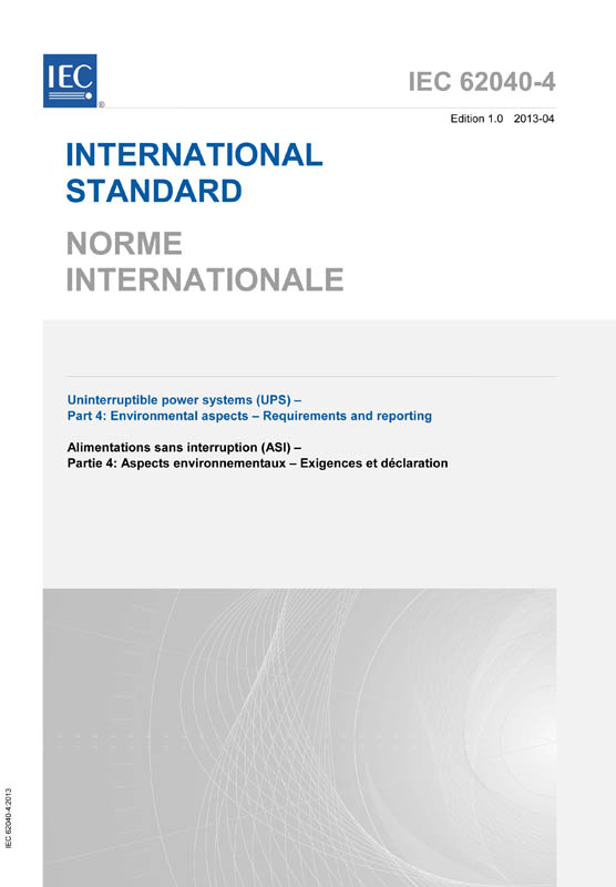 IEC 62040-4:2013 specifies the process and requirements to declare the environmental aspects concerning uninterruptible power systems (UPS), with the goal of promoting reduction of any adverse environmental impact during a complete UPS life cycle. This product standard is harmonized with the applicable generic and horizontal environmental standards and contains additional details relevant to UPS. This standard applies to movable, stationary and fixed UPS that deliver single or three-phase fixed frequency a.c. output voltage not exceeding 1 000 V a.c. and that present, generally through a d.c. link, an energy storage system and specified in IEC 62040 product standards for UPS.
