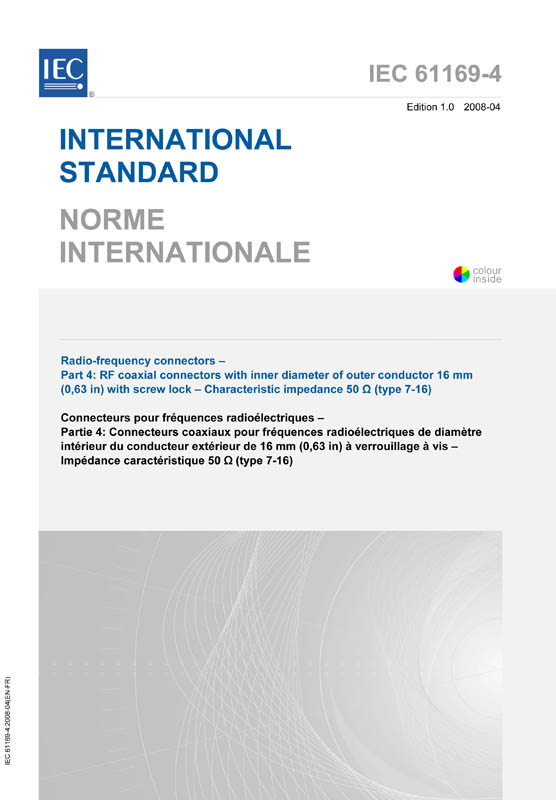 IEC 61169-4:2008 provides information and rules for the preparation of detail specifications (DS) for type 7-16 R.F. coaxial connectors with screw lock. It describes the interface dimensions for general purpose grade 2 connectors, dimensional details for standard test connectors, grade 0, together with gauging information and the mandatory tests selected from QC 22000 (IEC 61169-1), applicable to all DS relating to type 7-16 connectors.