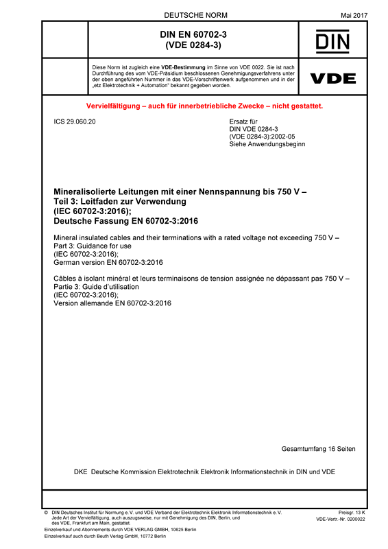 Die Norm DIN EN 60702-3 (VDE 0284-3) informiert die Anwender über die Eigenschaften und Grenzbedingungen mineralisolierter Leitungen, um Missbrauch der Leitungen zu verhindern.