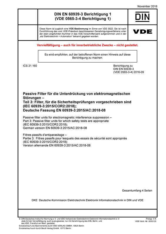 DIN EN 60939-3 VDE 0565-3-4 Berichtigung 1:2018-11