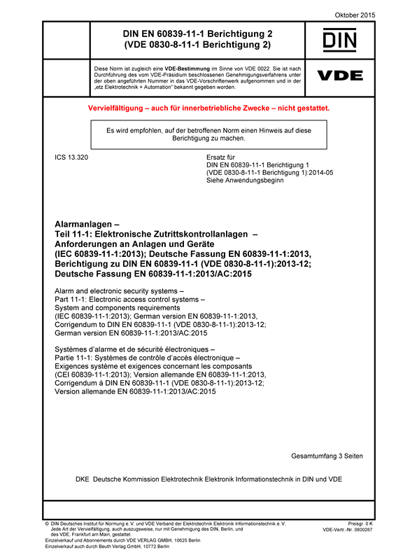 Durch diese zweite Korrektur wird die erste Korrektur der Norm DIN EN 60839-11-1 (VDE 0830-8-11-1):2013-12 "Alarmanlagen - Zutrittskontrollanlagen für Sicherungsanwendungen - Teil 11-1: Elektronische Zutrittskontrollanlagen - Anforderungen an Anlagen und Geräte" ersetzt.