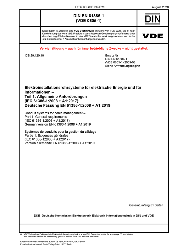 (IEC 61386-1:2008 + A1:2017); German version EN 61386-1:2008 + A1:2019 Class/Status: