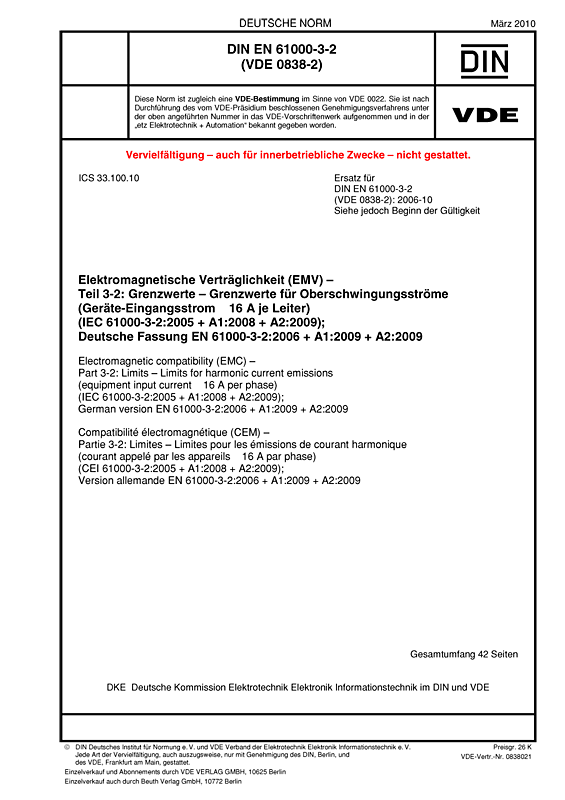 This standard contains the German version of the European Standard EN 61000-3-2:2006 + A1:2009 + A2:2009 and takes over the International Standard IEC 61000-3-2:2005 and its Amendment 1:2008 and Amendment 2:2009. It contains requirements for harmonic currents caused by electrical and electronic equipment with an input current < 16 A per Phase, which are intended for connection to a public low-voltage power distribution network, in the latter. In relation to the previous edition DIN EN 61000-3-2 (VDE 0838-2):2006-10 the normative references were updated, definitions and specifications concerning the repeatability and variability of results of measurements were added, clarifications to the limits for lighting equipment were done and the test conditions for amplifiers, lamps, washing machines and information technology equipment were amended.
